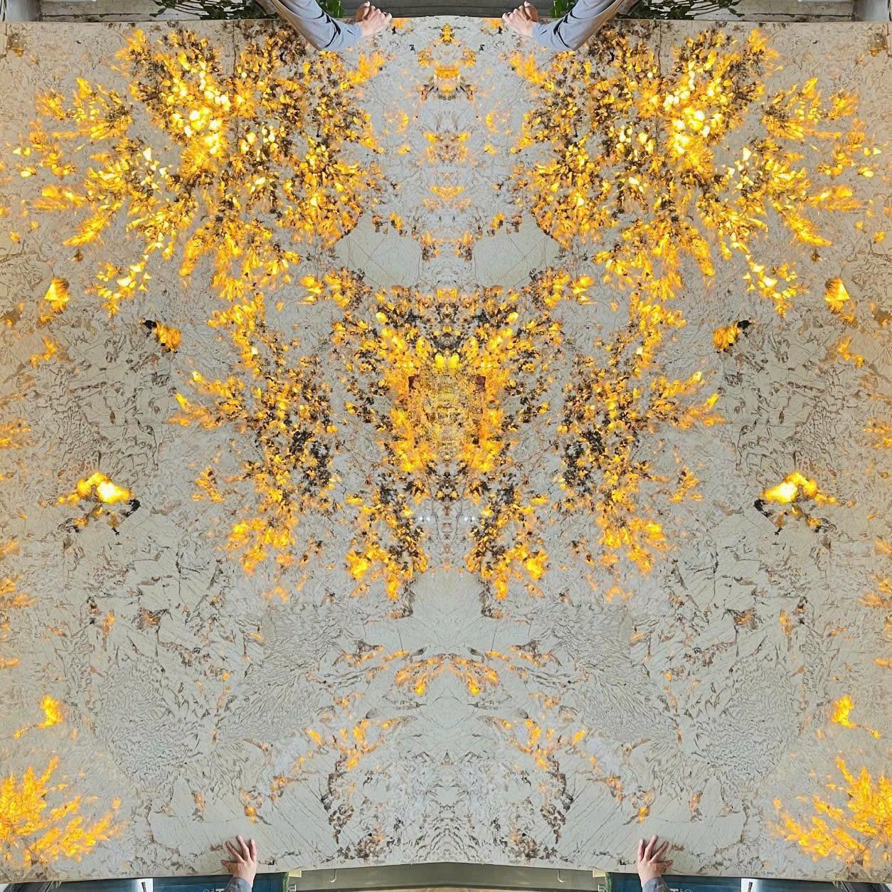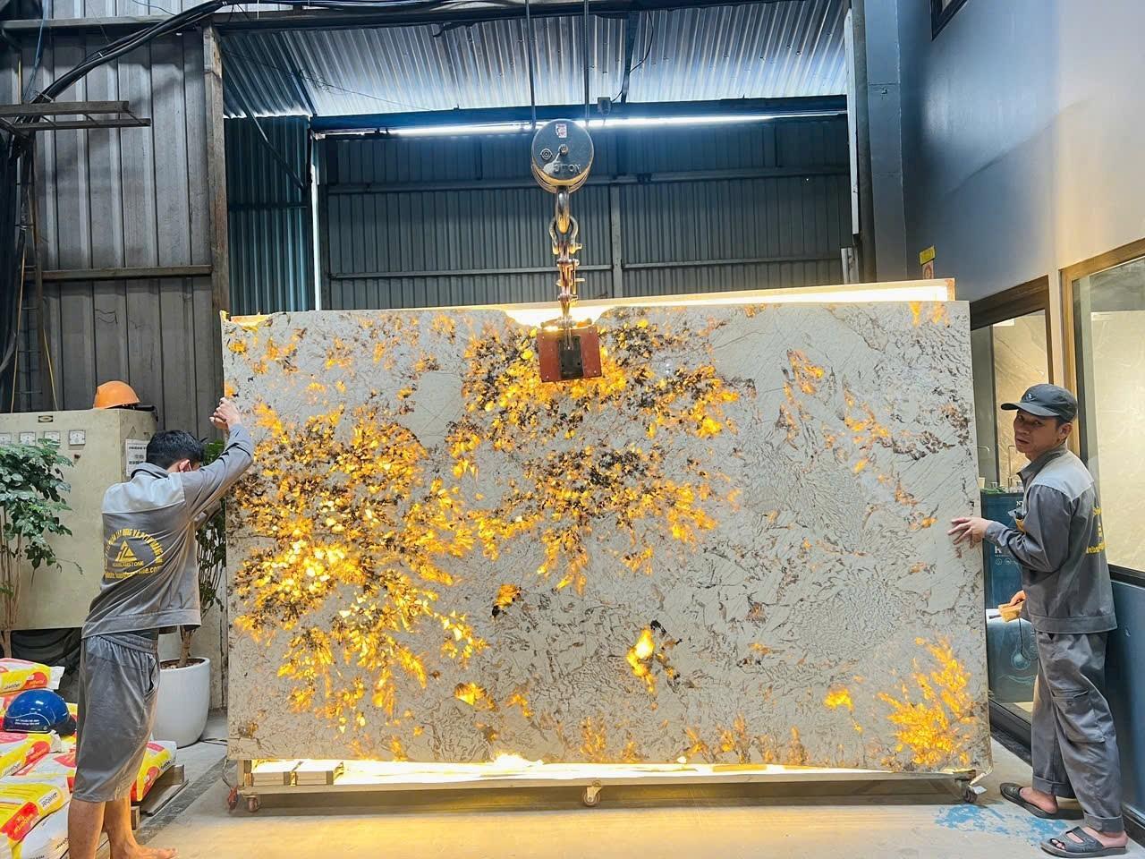 Thiết kế nguyên khối: Sử dụng 1 tấm đá nguyên khối với kích thước tiêu chuẩn 320 x 196 cm, mang lại sự liền mạch và tinh tế có thể ghép đứng hoặc ngang tùy theo nhu cầu của khách hàng.